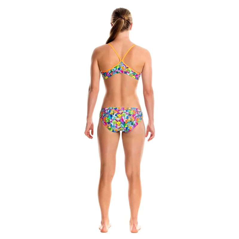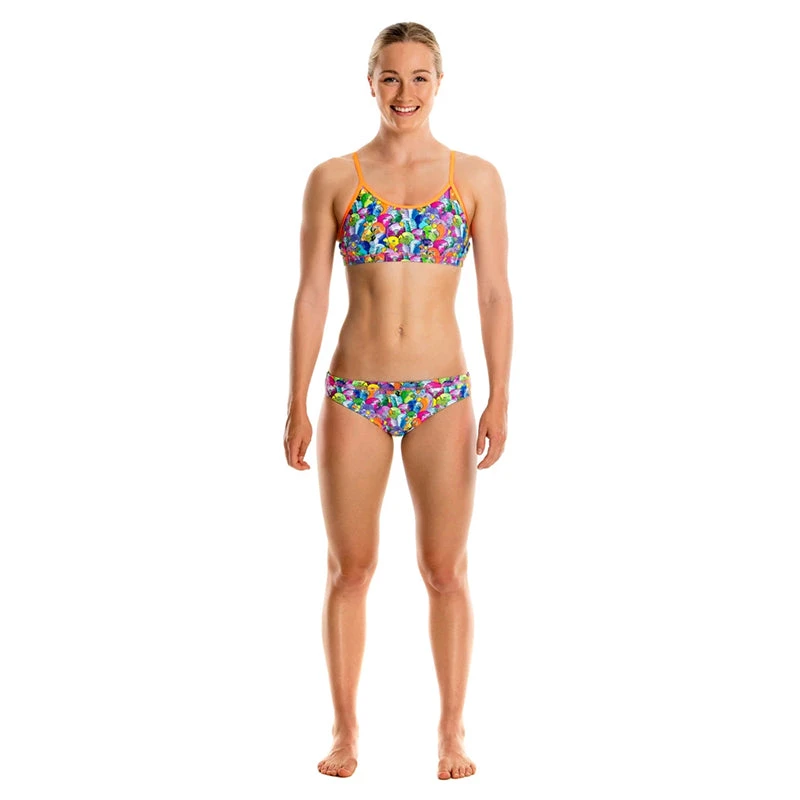 A firm fitting crop top and hipster brief suited to the sporty girl. It’s a secure fit with underbust and waist elastic and drawcord in the brief. Features a single shoulder bind strap finish.