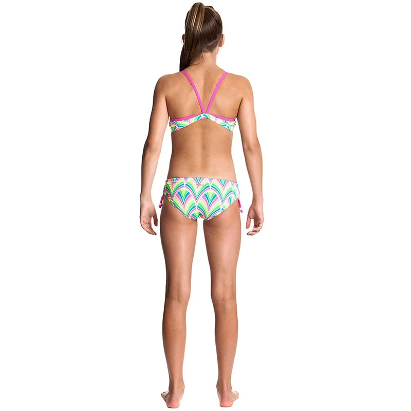 The Funkita City Sweetheart Girls Sports Bikini has bright and loud multi coloured arches made up of multiple shades of pink, green, yellow and light blue. The Funkita City Sweetheart has a hipster brief as well as a firm fitting triangular top that will suit long hours training or swimming laps.