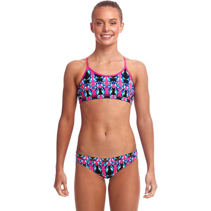A firm fitting crop top and hipster brief suited to the sporty girl. Its a secure fit with underbust and waist elastic and drawcord in the brief. Features a single shoulder bind strap finish.