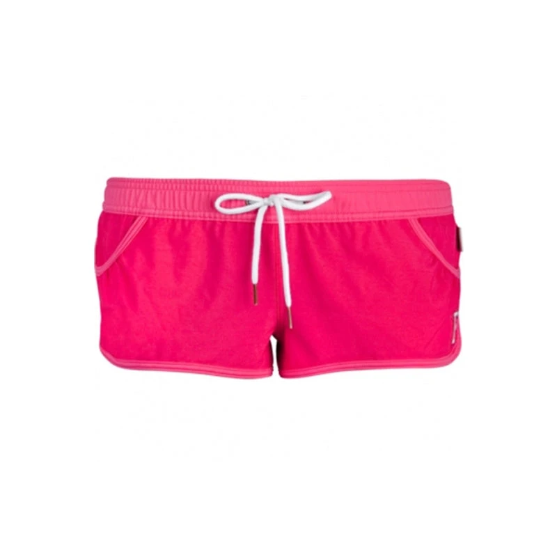 Loose fitting cropped pull-on beach short with shirred waist, side pockets and draw cord to fasten.