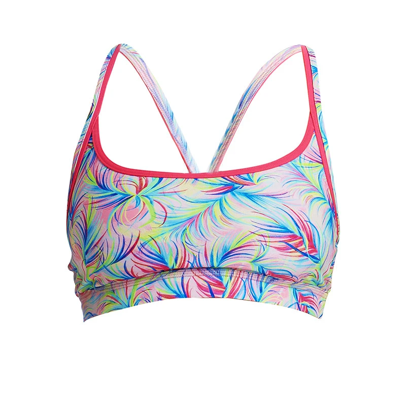Firm fitting sports crop top with racer back and double strap bind finish with wide elastic for under bust support to give you the support you need in a sports top. Sold as separates.