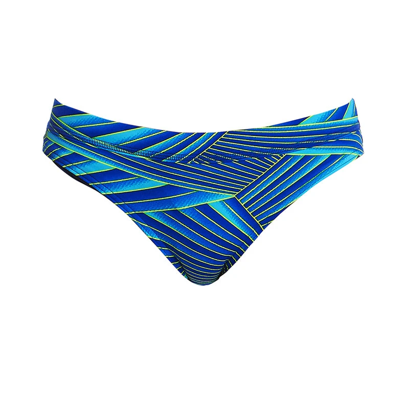 Hipster sports brief with drawcord and flat elastic waistband. Moderate leg rise and rear coverage. Sold as separates.