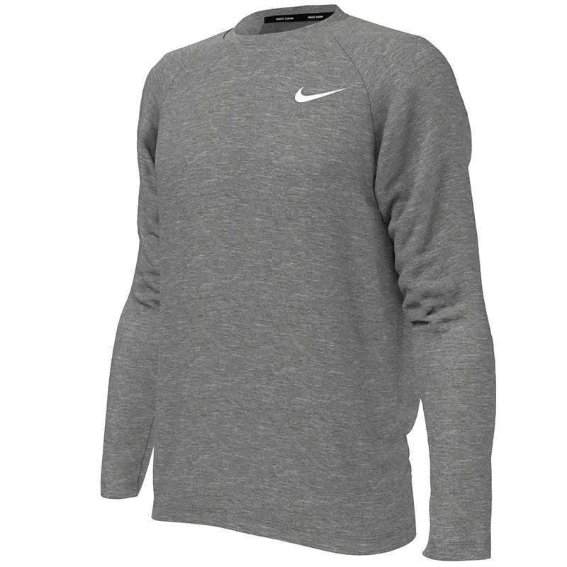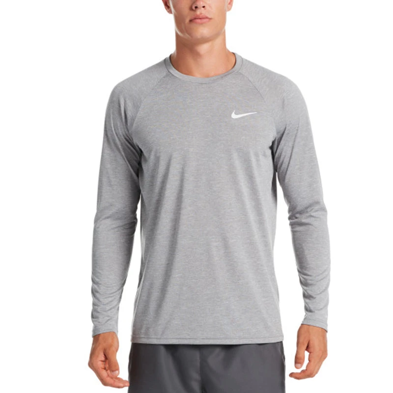 Nike Swim Men’s Heather Long Sleeve Hydroguard boasts Dri-FIT technology to help you stay comfortable both in the pool and the beach. The heathered fabric boasts plenty of stretch for a flexible fit and a wide range of motion. UPF 40+ protection helps to defend against UV rays from penetrating through the swim shirt. (NESSA590)