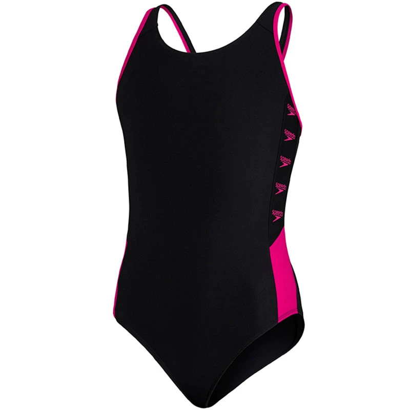 Iconic Speedo style. This sleek black Muscleback suit features an eye-catching pink splice of our iconic print down its side. Great for longer swim sessions, the muscleback style enables your child to achieve a full range of motion during their swim. Quick-drying and stretchy to keep active kids comfortable, it’s made from Endurance10 fabric which is designed to keep its shape. (812859B344)